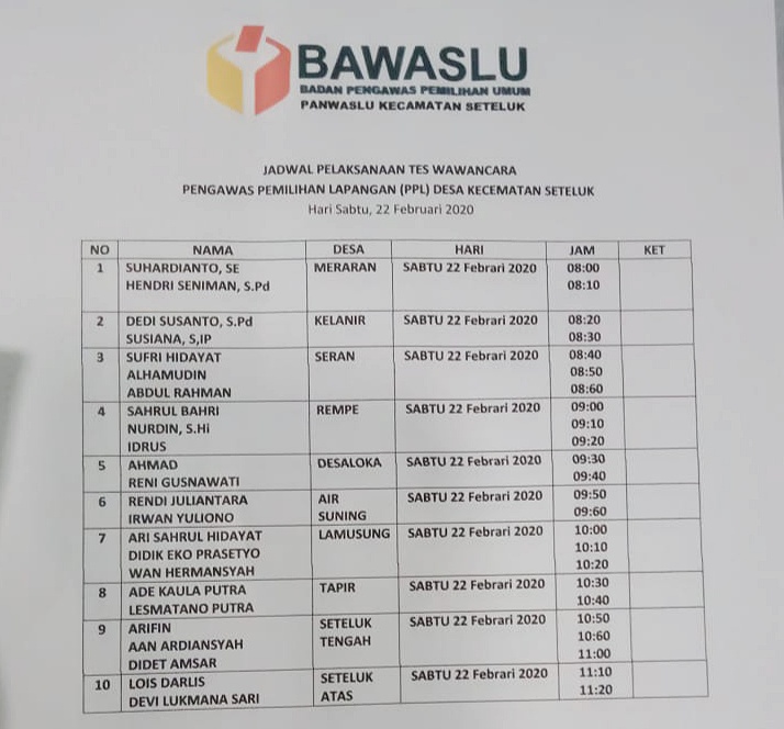 Berdasarkan data yang kami peroleh dari Panwascam Kecamatan Seteluk, ada 24 peserta yang lolos tes administrasi dan akan diuji kembali kemampuannya di tes interview.