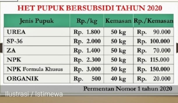 Kenaikan harga pupuk bersubsidi tersebut, sebagaimana tertuang dalam Peraturan Menteri Pertanian No 49 Tahun 2020 tertanggal 30 Desember 2020, yang mengatur tentang Harga Eceran Tertinggi (HET) pupuk bersubsidi.