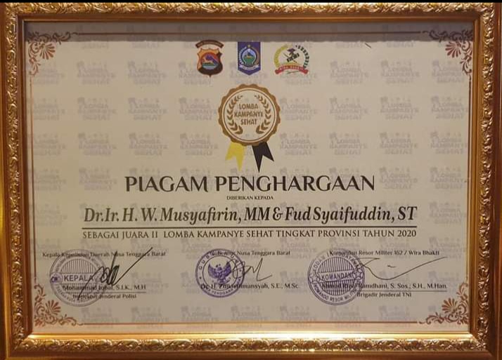 Sumbawa Barat, CDN- Tim kampanye F3 jilid 2 berhasil mendapatkan juara 2 lomba kampanye sehat yang diselenggarakan oleh Kapolda Nusa Tenggara Barat (NTB). Piala penghargaan diterima langsung oleh ketua koalisi KSB Baik, Norvie Aperiansyani ST., MA. Penghargaan tersebut diserahkan langsung oleh wakil Gubernur NTB, DR. H. Siti Rohmi Djalilah. di Polda NTB pada Kamis Sore (27/05/2021).