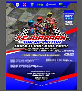 Balapan road race sendiri mengambil tema “Kejuaraan Motor Bupati Sumbawa Cup KSB 2022”, kejuaraan ini dibuka untuk 15 kelas. Untuk lebih lengkapnya tentang kelas-kelas yang diperlombakan dan informasi tambahan, maka panitia selalu standby disekretariat yang beralamatkan di Jalan Banjar, Roropedi, Taliwang-KSB. Nomor kontak yang bisa dihubungi 085253878870 atau 081238958525.